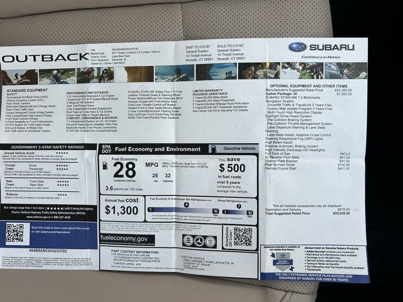 Standard Equipments on 2017 Subaru Outback 2.5i Limited in West Springfield, MA